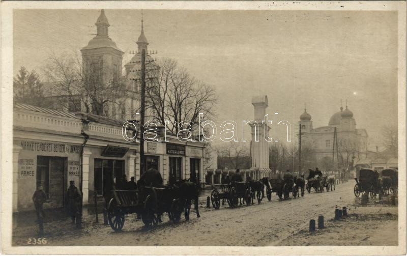 Beschreibung: Volodymyr-Volynskyi, Wladimir Wolynsky, Wladimir Wolinskij; Am Hauptplatz / main square, shops, street view with K.u.K. soldiers. Originalfoto F. J. Marik 1916.