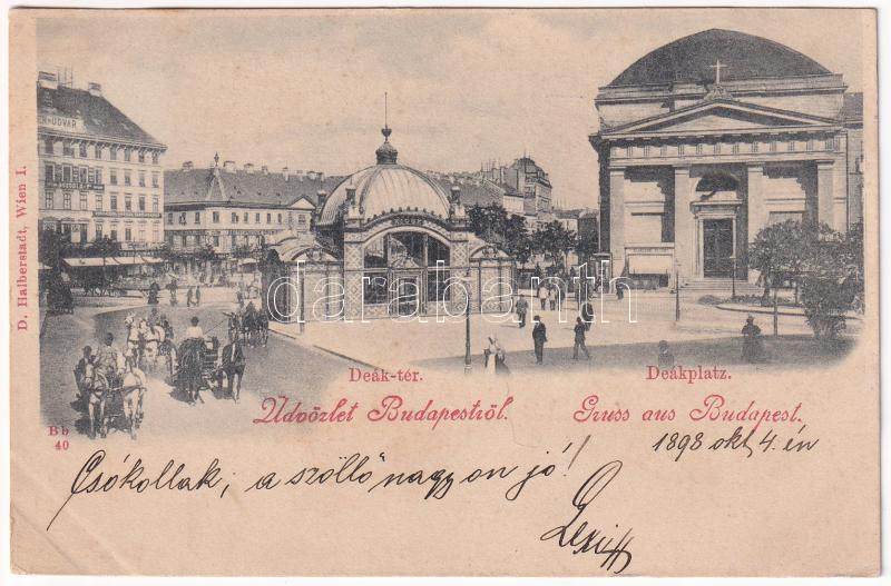 1898 (Vorläufer) Budapest V. Deák tér, Kiosk, Aszódi S. és társa, Kereskedők és Iparosok Banktársasága, Bretschneider Zsigmond és Glanzdorf Péter üzlete. D. Halberstadt (ázott / wet damage)