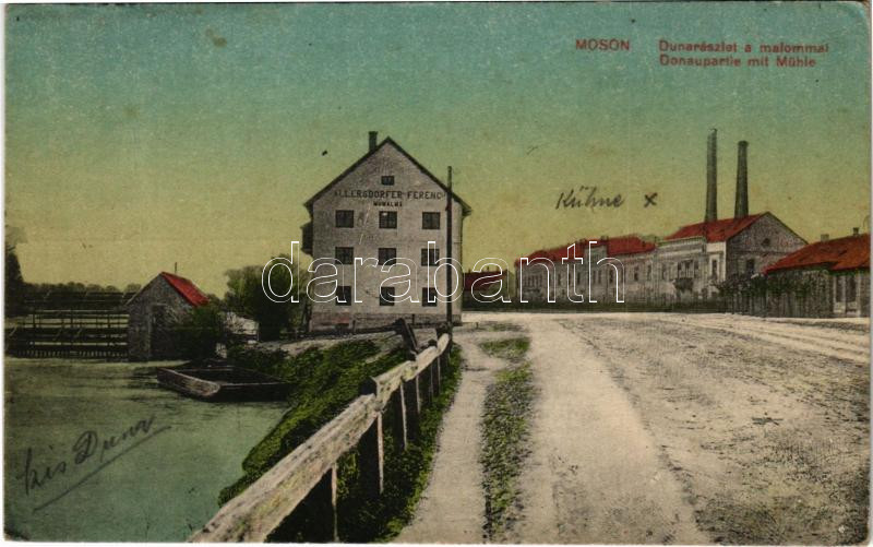 Beschreibung: 1926 Moson (Mosonmagyaróvár), Dunai részlet, Allersdorfer Ferenc műmalom. Fischer Ignác kiadása (Rb)