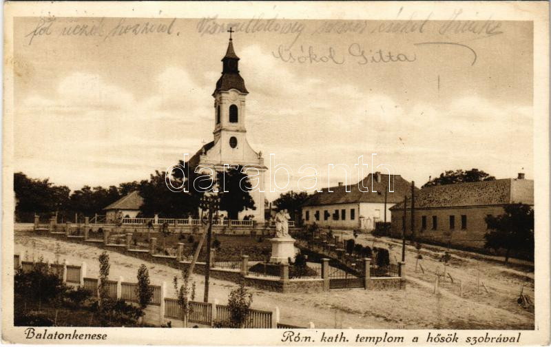 1933 Balatonkenese, Római katolikus templom a hősök szobrával https://www.darabanth.com/de/442-Fernauktion/442.0/Ansichtskarten/Ungarn~2000005/1933-Balatonkenese-Romai-katolikus-templom-a-hosok-szobraval~II2907078