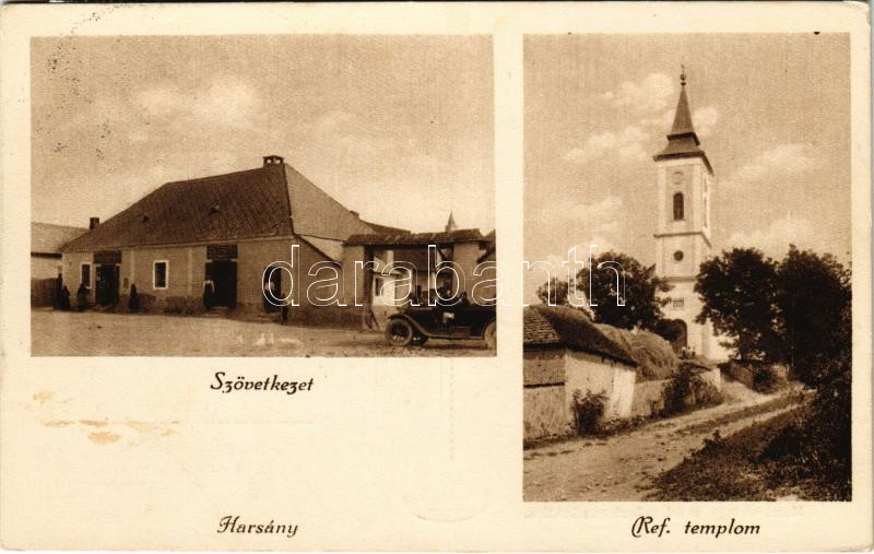 1933 Harsány, Református templom, automobil, Hangya szövetkezet üzlete... https://www.darabanth.com/de/442-Fernauktion/442.0/Ansichtskarten/Ungarn~2000005/1933-Harsany-Reformatus-templom-automobil-Hangya-szovetkezet-uzlete-es-sajat-kiadasa-fl~II2906826