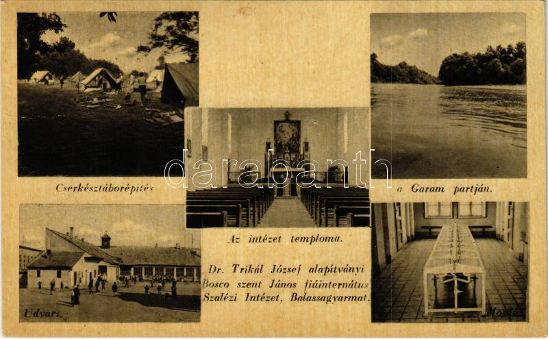 1943 Balassagyarmat, Dr. Trikál József alapítványi Bosco szent János fiú internátus Szalézi Intézet, Cserkésztábor építés a Garam partján, udvar, az intézet temploma, belső, mosdó