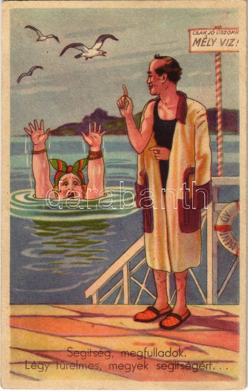 Balaton, "Segítség megfulladok. Légy türelmes, megyek segítségért... https://www.darabanth.com/de/442-Fernauktion/442.0/Ansichtskarten/Ungarn~2000005/Balaton-Segitseg-megfulladok-Legy-turelmes-megyek-segitsegert-Humoros-karikatura-EK~II2906903