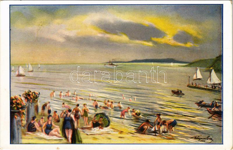Beschreibung: Balaton, Turisztikai reklámlap, fürdőzők. Magyar Királyi Államvasutak Igazgatósága s: Wágner Géza