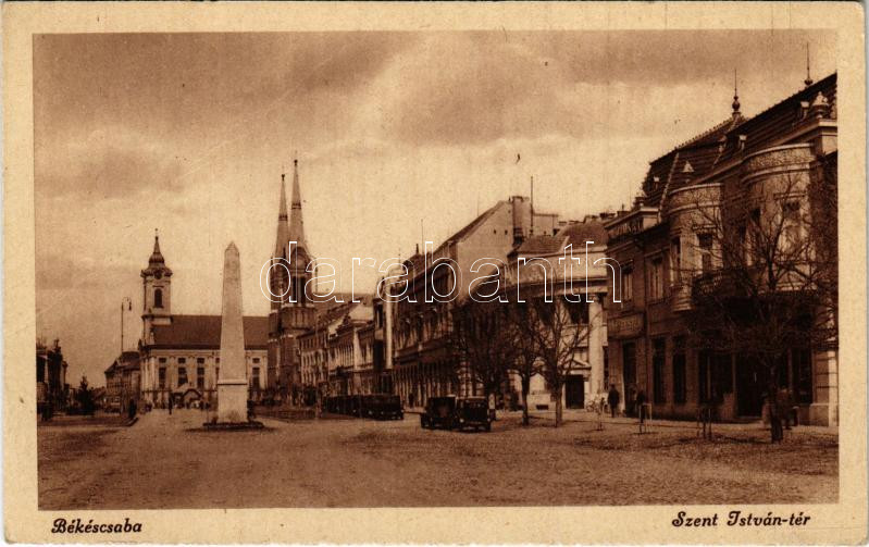 Beschreibung: Békéscsaba, Szent István tér, autók, emlékmű, takarékpénztár, postahivatal