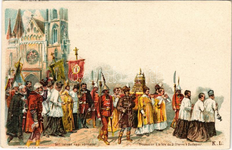 Beschreibung: Budapest I. Ezredéves Országos Kiállítás, Királyi vár, Mátyás templom, Szent István napi körmenet, Posner és Fia litho barna 2 Kr. Ga. s: K. L. (EK)