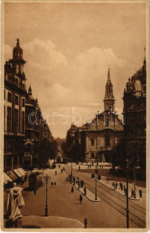 Beschreibung: Budapest V. Kossuth Lajos utca, emeletes autóbusz, villamosok, Szénásy és Steyr üzlete