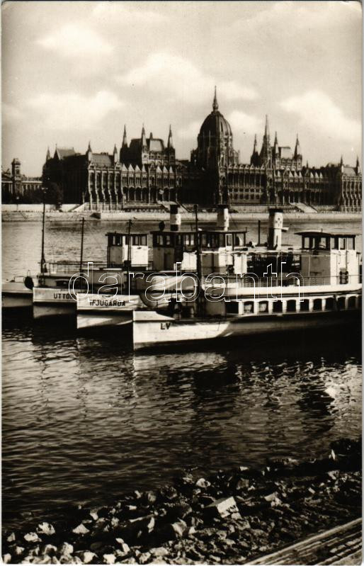 Beschreibung: Budapest V. Országház, Parlament, "LV", MHRT "IFJÚGÁRDA" és "ÚTTÖRŐ" gőzhajók. Képzőművészeti Alap Kiadóvállalat (EK)