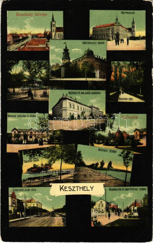 Keszthely, Főgimnázium, Gróf Festetics palota és szobor, Balaton szálloda és sétány, Főút, gazdasági akadémia, fürdő, Kossuth Lajos utca, Andrássy tér. Mérei Ignác I. 910. (EK)