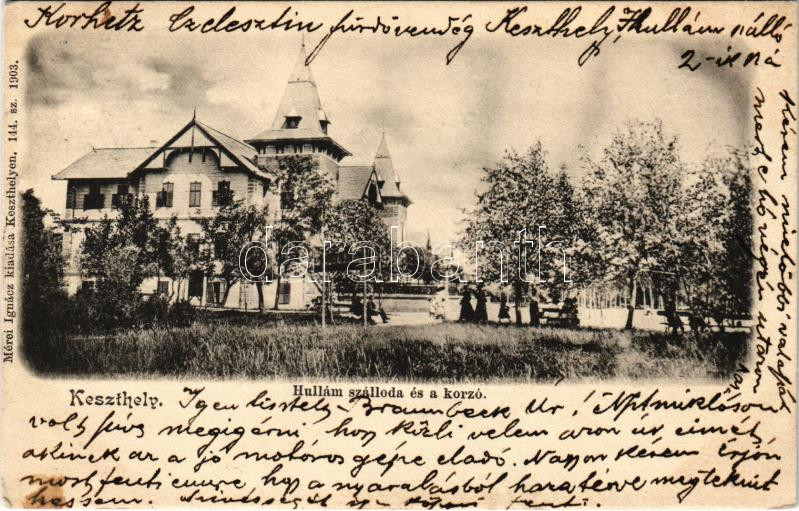 Keszthely, Hullám szálloda és a korzó. Mérei Ignác 144. 1903. (fl) https://www.darabanth.com/de/442-Fernauktion/442.0/Ansichtskarten/Ungarn~2000005/Keszthely-Hullam-szalloda-es-a-korzo-Merei-Ignac-144-1903-fl~II2909956