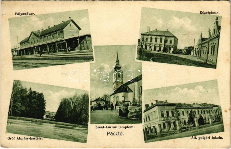 Pásztó, Pályaudvar, vasútállomás, Községháza, Gróf Almásy kastély, Sze... https://www.darabanth.com/de/442-Fernauktion/442.0/Ansichtskarten/Ungarn~2000005/Paszto-Palyaudvar-vasutallomas-Kozseghaza-Grof-Almasy-kastely-Szent-Lorinc-templom~II2909402