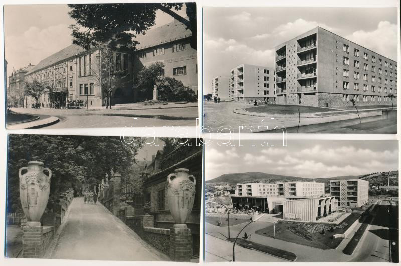 Pécs - 8 db modern főleg 1,20 Ft-os Képzőművészeti Alap képeslap (villamosok, autóbuszok, Újmecsekalja, Legényszállás, Újváros Olimpia étterem, Zsolnay udvar, Nagy Lajos gimnázium, Széchenyi tér, Meszes bányászok új lakóházai)