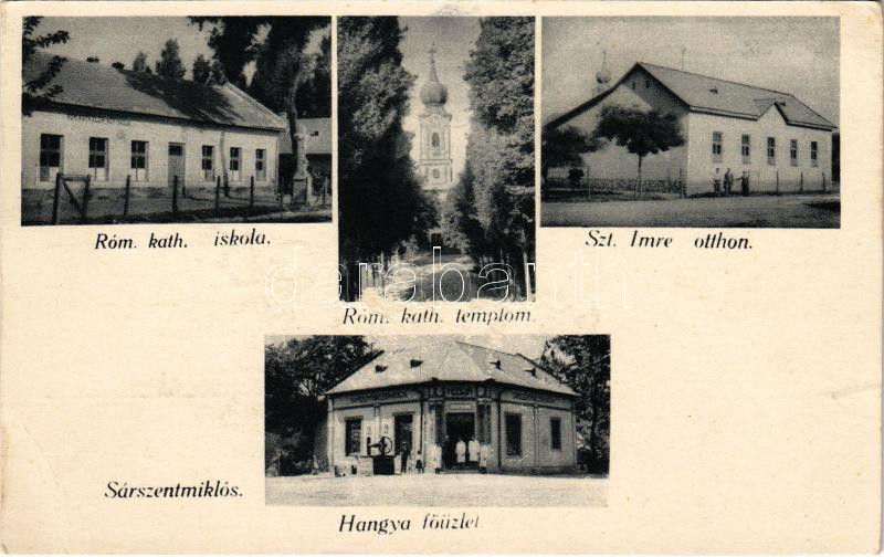 Beschreibung: Sárszentmiklós (Sárbogárd), Római katolikus templom és iskola, Szt. Imre otthon, Hangya főüzlet (EK)