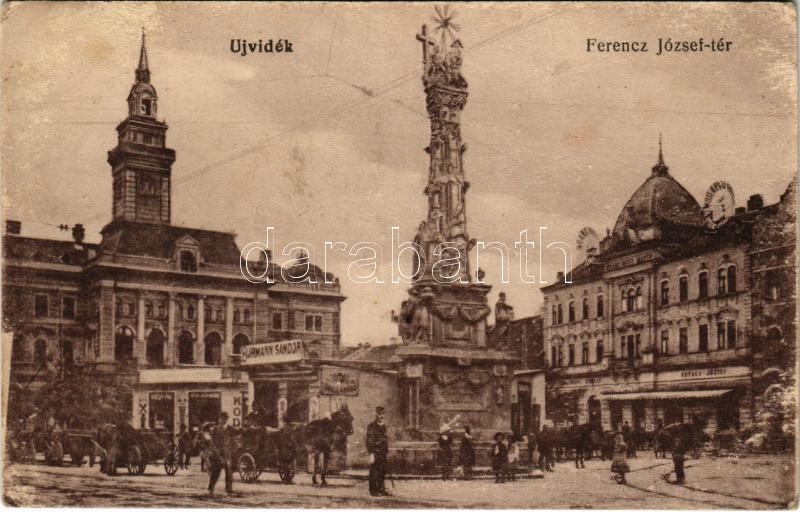 1917 Újvidék, Novi Sad; Ferenc József tér, Grand Hotel Mayer szálloda, Szentháromság szobor, Burmann Sándor üzlete. Vasúti levelezőlapárusítás 9896. / square, hotel, Holy Trinity statue, shops (felületi sérülés / surface damage)