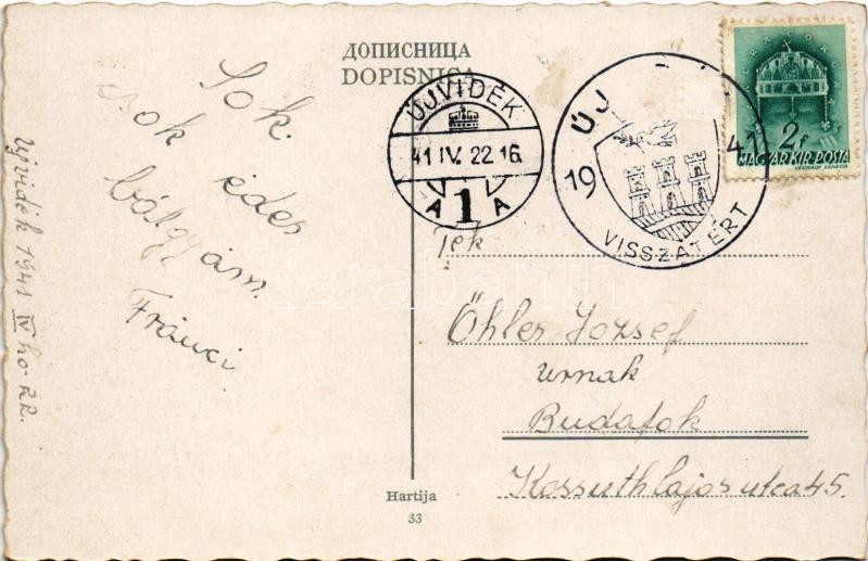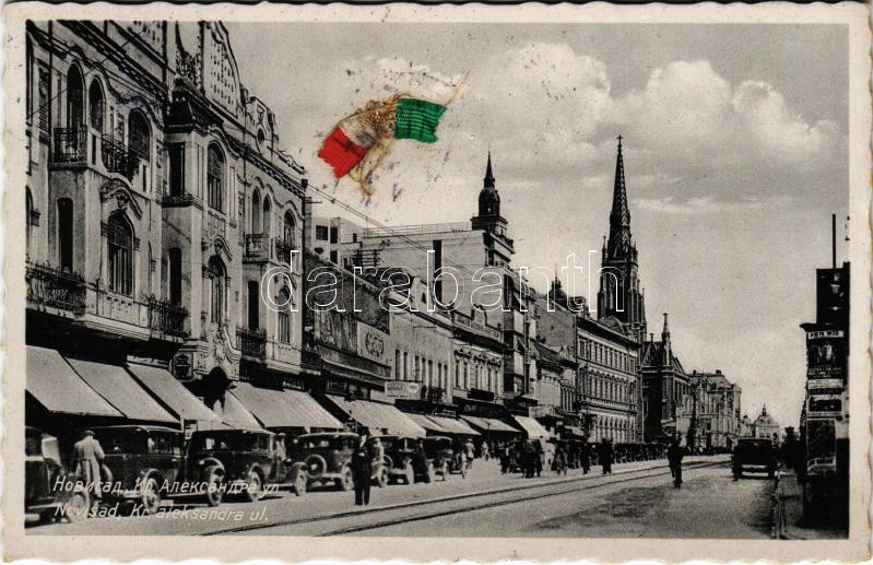 1941 Újvidék, Novi Sad; Kr. Aleksandra ul. / utca, automobilok, üzletek. Magyar zászló szalag és visszatért bélyegzés / street view, automobiles, shops, Hungarian flag textile + "1941 Újvidék visszatért" So. Stpl. (fl)