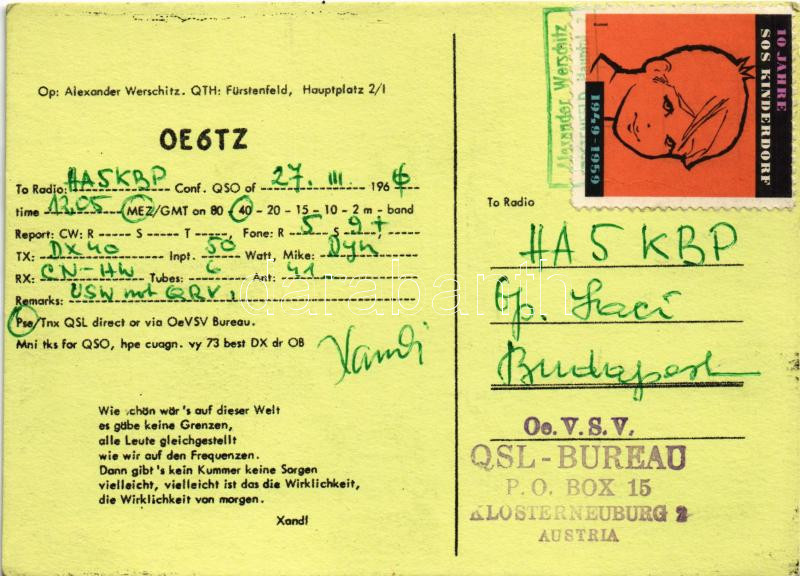 1959 Op: Alexander Werschitz. QTH: Fürstenfeld, Hauptplatz 2/1. QSL rá... https://www.darabanth.com/de/442-Fernauktion/442.0/Ansichtskarten/Werbungen~2000093/1959-Op-Alexander-Werschitz-QTH-Furstenfeld-Hauptplatz-21-QSL-radioamator-lap-OE6TZ-QSL-~II2797410