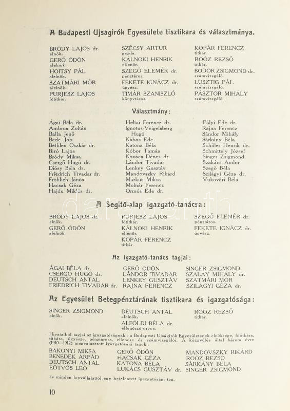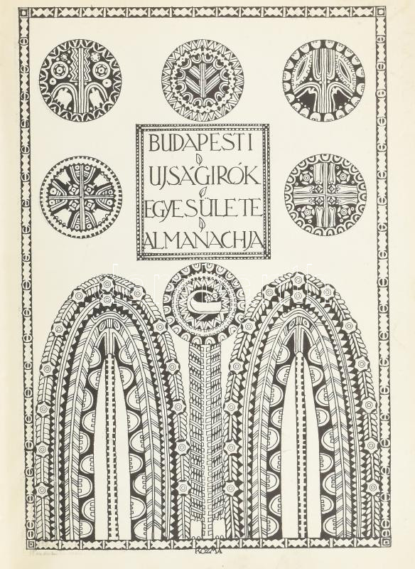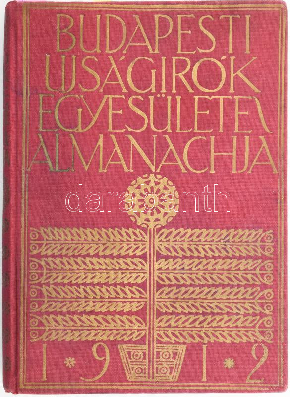 1912 Budapesti Újságírók Egyesülete és Almanachja 1912. Bp., 1912, Nyugat-ny., 2+7-368+1 p. Szövegközti fekete-fehér képanyaggal. Korabeli reklámokkal. A címlapon és az előzéklapon Kozma Lajos szecessziós rajzával. Benne az Budapesti Ujságírók Egyesületének tisztikarával és választmányával. Kiadói szecessziós, festett egészvászon-kötés, kissé kopott, kissé foltos borítóval.