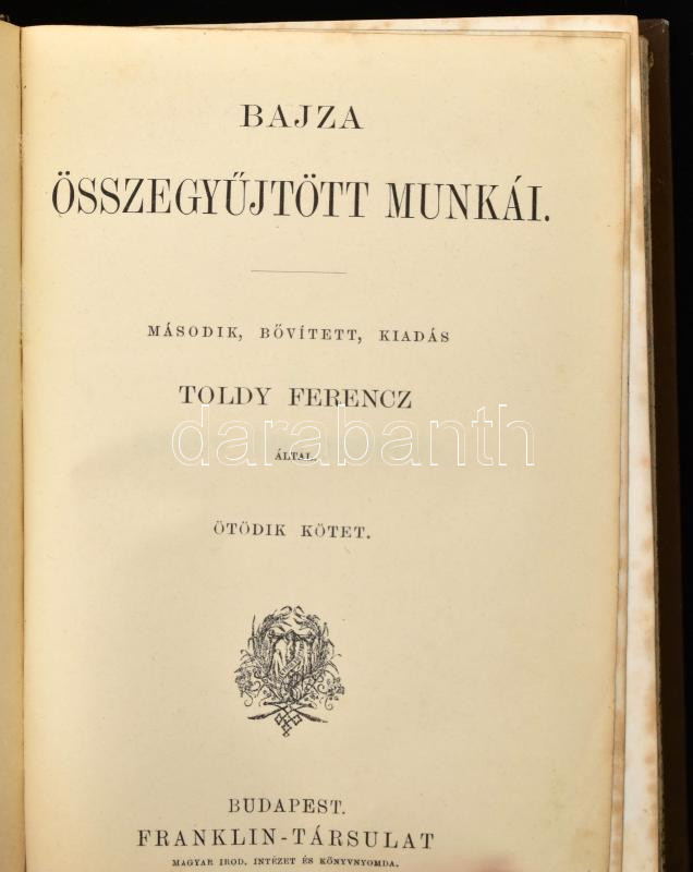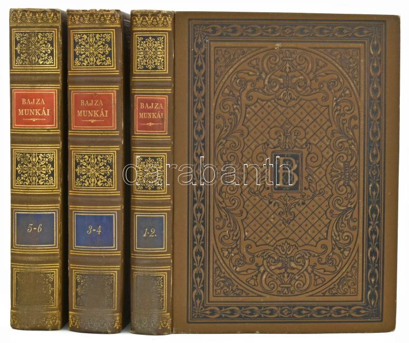 Bajza [József]: Bajza összegyűjtött munkái. I-VI. köt. [3 kötetben]. Második, bővített kiadás, Toldy Ferenc által. Magyar Remekírók. Bp., é.n., Franklin-Társulat. Kiadói aranyozott gerincű, festett egészvászon-kötés, Gottermayer-kötés, márványozott lapélekkel, a borítón némi kopással, helyenként kissé foltos lapokkal.