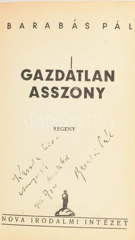 Barabás Pál: Gazdátlan asszony. Bp., é.n. Nova. DEDIKÁLT példány. Kiad... https://www.darabanth.com/de/442-Fernauktion/442.0/Bucher/Bucher-Andere-kuriositaten~1000027/Barabas-Pal-Gazdatlan-asszony-Bp-en-Nova-DEDIKALT-peldany-Kiadoi-vaszonkotesben~II2914614