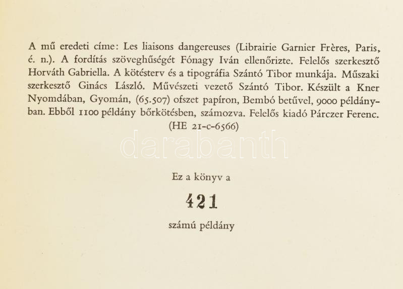Choderlos de Laclos, [Pierre Ambroise François (1741-1803)]: Veszedelmes viszonyok. Ford. és az utószót írta: Örkény István. Würtz Ádám illusztrációival. Bp., 1965., Magyar Helikon. Kiadói egészbőr-kötésben, kiadói illusztrált kartontokban, a gerincen és a tokon kis kopásnyomokkal. Számozott (421./1100) példány.
