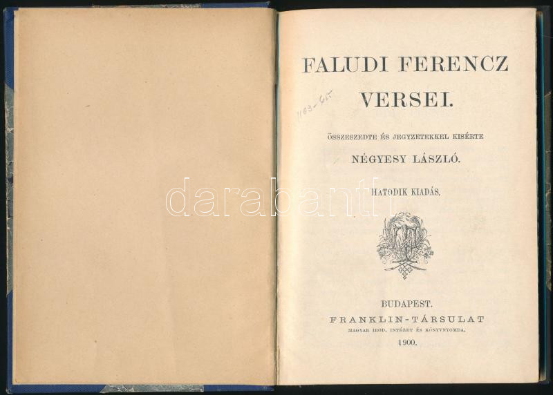 [Faludi Ferenc (1704-1779)]: Faludi Ferenc versei. Összeszedte és jegyzetekkel kísérte: Négyesy László. Bp., 1900, Franklin-Társulat, 182 p. Átkötött félvászon-kötésben, jó állapotban.