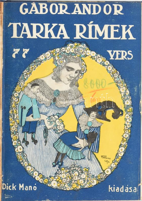 Gábor Andor: Tarka rÃmek. 77 vers. Bp.,(1913), Dick Manó,(Nap Nyomda Bt.-ny.), 128 p. KésÅ‘bbi átkötött félvászon-kötés, az eredeti illusztrált papÃrborÃtó felhasználták,. ElsÅ‘ kiadás. A borÃtó Faragó Géza (1877-1928) festÅ‘, grafikus, illusztrátor munkája.