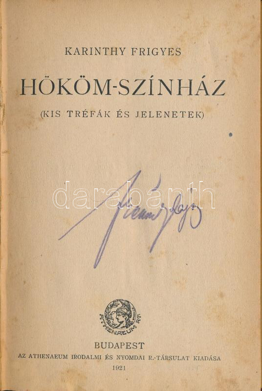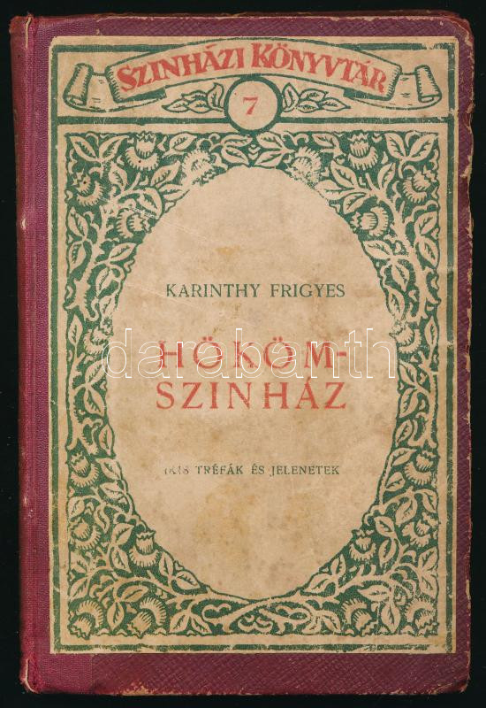 Karinthy Frigyes: Hököm-színház. (Kis tréfák és jelentek.) Színházi Könyvtár 7. Bp., 1921, Athenaeum. Első kiadás. Átkötött félvászon-kötés, az eredeti illusztrált elülső borítót a borítóra kasírozták, kopott borítóval, kissé foltos lapokkal.