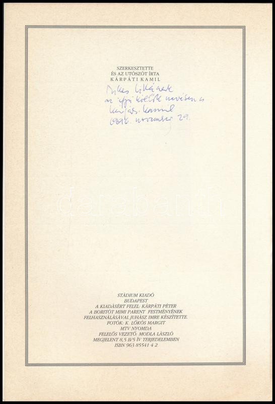 Kárpáti Kamil: Lépcsők a csendbe. Antológia. Szerk. és az utószót írta: - -. A szerkesztő, Kárpáti Kamil által DEDIKÁLT példány. Bp., 1996., Stádium. Kiadói papírkötés.