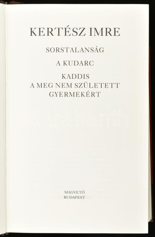 Kertész Imre: Sorstalanság, A kudarc, Kaddis a meg nem született gyerm... https://www.darabanth.com/de/442-Fernauktion/442.0/Bucher/Bucher-Andere-kuriositaten~1000027/Kertesz-Imre-Sorstalansag-A-kudarc-Kaddis-a-meg-nem-szuletett-gyermekert-Bp-2002-Magveto~II2913826