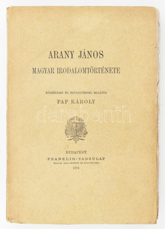 Pál Károly: Arany János magyar irodalomtörténete. Közzéteszi és bevezetéssel ellátta: - - . Bp., 1911, Franklin-Társulat, 222 p. Kiadói papírkötés, helyenként kissé sérült, több lap (35-46. old.) kijár. A szerző által DEDIKÁLT példány.