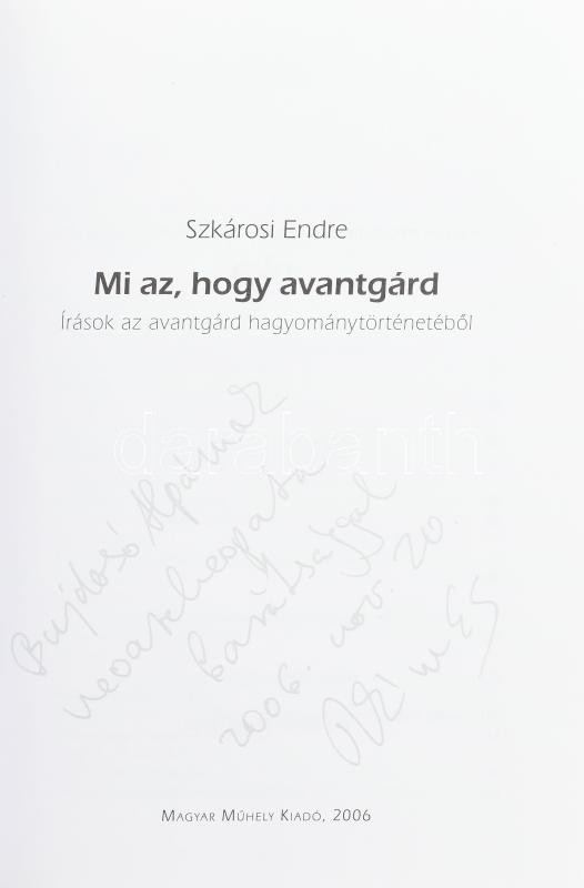 Szkárosi Endre: Mi az, hogy avantgárd. Írások az avantgárd hagyománytörténetéből. A szerző, Szkárosi Endre (1952-2022) József Attila-díjas költő, művészeti író, műfordító, kritikus, irodalomtörténész által Bujdosó Alpár (1935-2021) költő, mérnök, a Magyar Műhely szerkesztője a magyar avantgarde kiemelkedő alakja részére DEDIKÁLT példány. Underground expanzió 1. Bp., 2006., Magyar Műhely. Kiadói papírkötés.