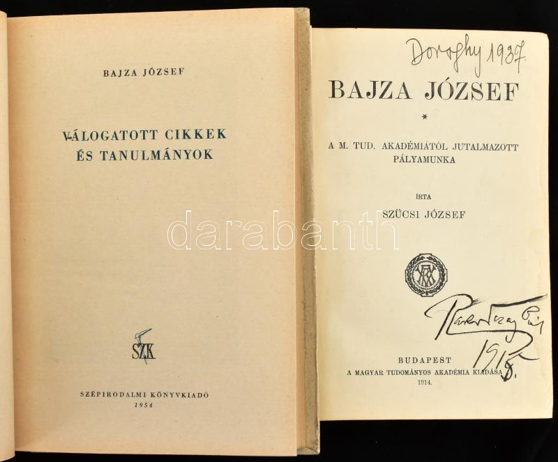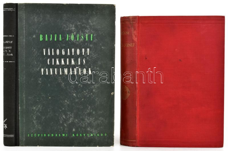 Szücsi József: Bajza József. A M. Tud. Akadémiától jutalmazott pályamunka. Bp., 1914, MTA (Hornyánszky-ny.), 2 sztl. lev.+497+(1) p. Kiadói aranyozott egészvászon-kötés, a gerincen kis foltokkal, néhány lapon kis lapszéli szakadással/folttal, tulajdonosi névbejegyzéssel, több lapon ceruzás bejegyzésekkel. + Bajza József: Válogatott cikkek és tanulmányok. Vál., a bevezetőt és az útmutatót írta: Lukácsy Sándor. Bp., 1954, Szépirodalmi Könyvkiadó. Kiadói félvászon-kötés, kissé kopottas borítóval. Megjelent 3000 példányban.