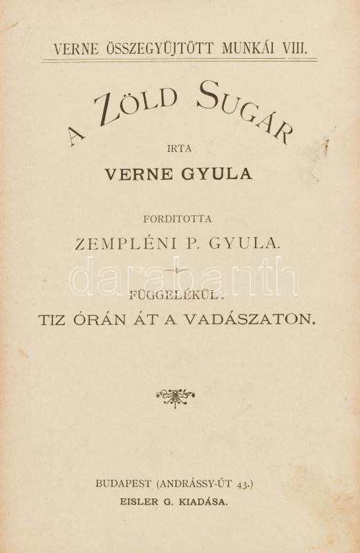 Verne Gyula: A zöld sugár függelékül: Tíz órán át a vadászaton. Verne Gyula összegyűjtött munkái. Ford.: Zempléni Gyula. Bp.,é.n. Eisler. Korabeli enyhén sérült félvászon kötésben