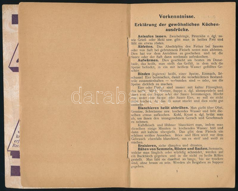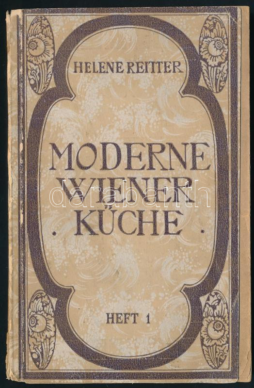 Helene Reitter: Moderne Wiener Küche. Heft 1. Bécs, é.n. (1910-15 k.), Rosenbaum (Leopold Heidrich beragasztott címkével). Német nyelven. Kiadói papírkötés, kissé sérült gerinccel, könyvtest elvált a borítótól, néhány kevés lapon apró lapszéli, szöveget nem érintő sérüléssel.