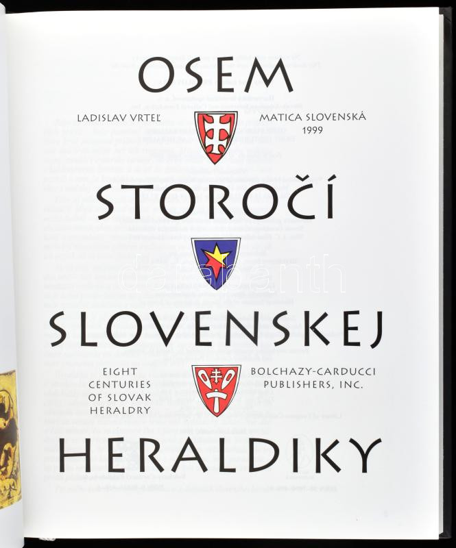 Ladislav Vrtel: Osem storočí slovenskej heraldiky. / Eight Centruries of Slovak Heraldry. Martin-Wauconda, 1999, Matica slovenská - Bolchazy-Carducci Publishers, Inc. Szlovák és angol nyelven. Gazdag magyar vonatkozású heraldikai anyaggal! Kiadói kartonált papírkötés. / In Slovakian and English language. Hard binding.