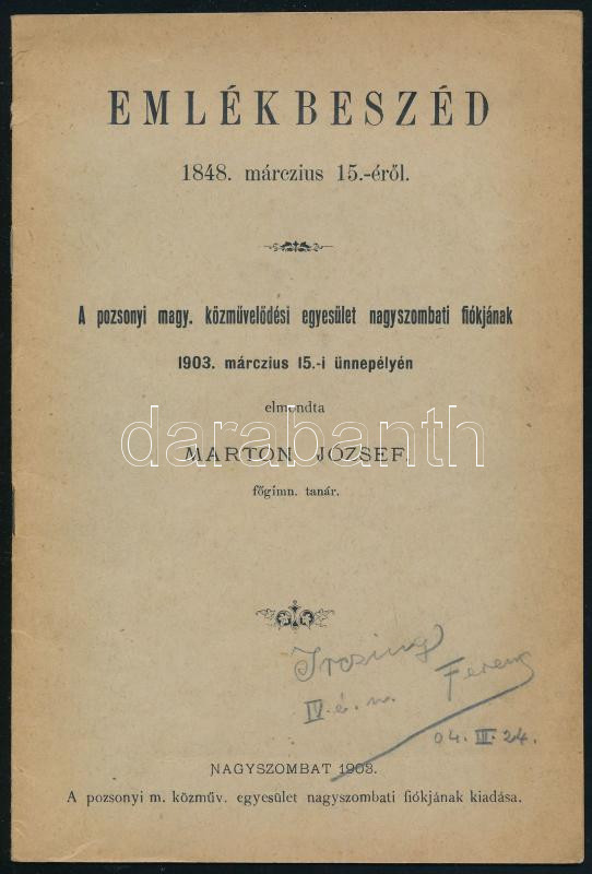 Marton József: Emlékbeszéd 1848. március 15.-éről. A pozsonyi magyar közművelődési egyesület nagyszombati fiókjának 1903. márczius 15.-i elmndta - -, főgimn. tanár. Nagyszombat, 1903, Pozsonyi M. Közműv Egyesület Nagyszombati Fiókjának, 11 p.