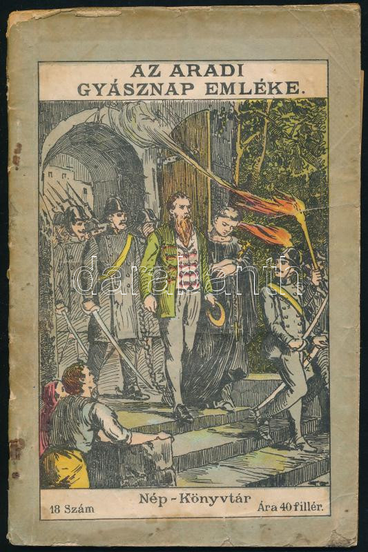 Szabó Antal: A tizenhárom aradi vértanu. Az aradi vértanuk félszázados évfordulójára. Az Aradi Gyásznap Emléke. Nép-Könyvtár 18. sz. Bp.,(1899), Bálint Lajos, 32 p. Kiadói illusztrált papírkötés, javított, foltos, szakadt borítóval, kissé sérült lapszélekkel.