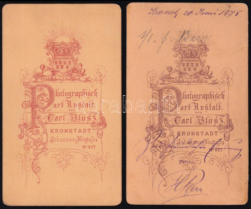 Beschreibung: 1875 2 db portré fotó Carl Blösz brassói (Kronstadt/Brasov) műterméből, keményhátú fotók erdélyi címeres verzókkal, az egyiken dedikációval, 10x6 cm