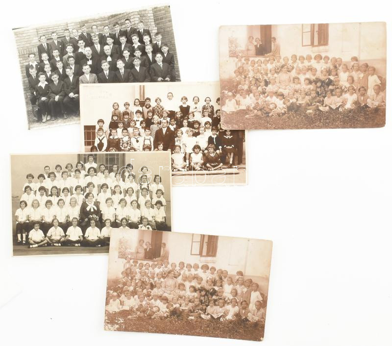 cca 1920-40 össz. 5 db magyar iskolai csoportkép, többségében szárazbélyegzővel v. pecséttel jelzett: Medgyesegyháza, Lakata Pál (2 db uyganazon csoportról), Fridrich Szentes, fotólap 9x14 cm