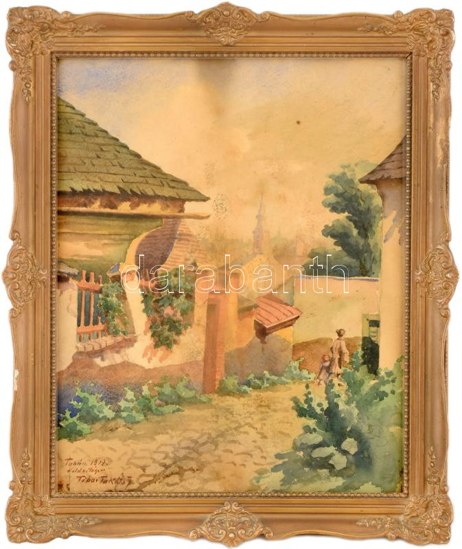 Beschreibung: Tibai Takáts János (1876-1943): Tabán, Holdvilág utca. Akvarell, papír, jelezve balra lent. Dekoratív, üvegezett, kissé sérült fakeretben, 41x33 cm.