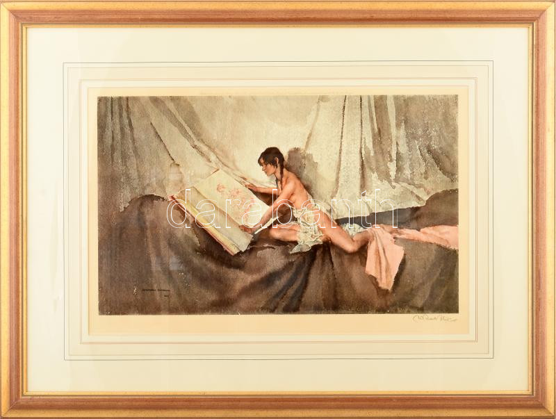 William Russell Flint (1880-1969): Női akt. Nyomat, papír, jelzett. Frost & Reed kiadása, 1963. Üvegezett fakeretben. 33x54 cm/ print on paper, signed, published by Frost & Reed in 1963, framed,