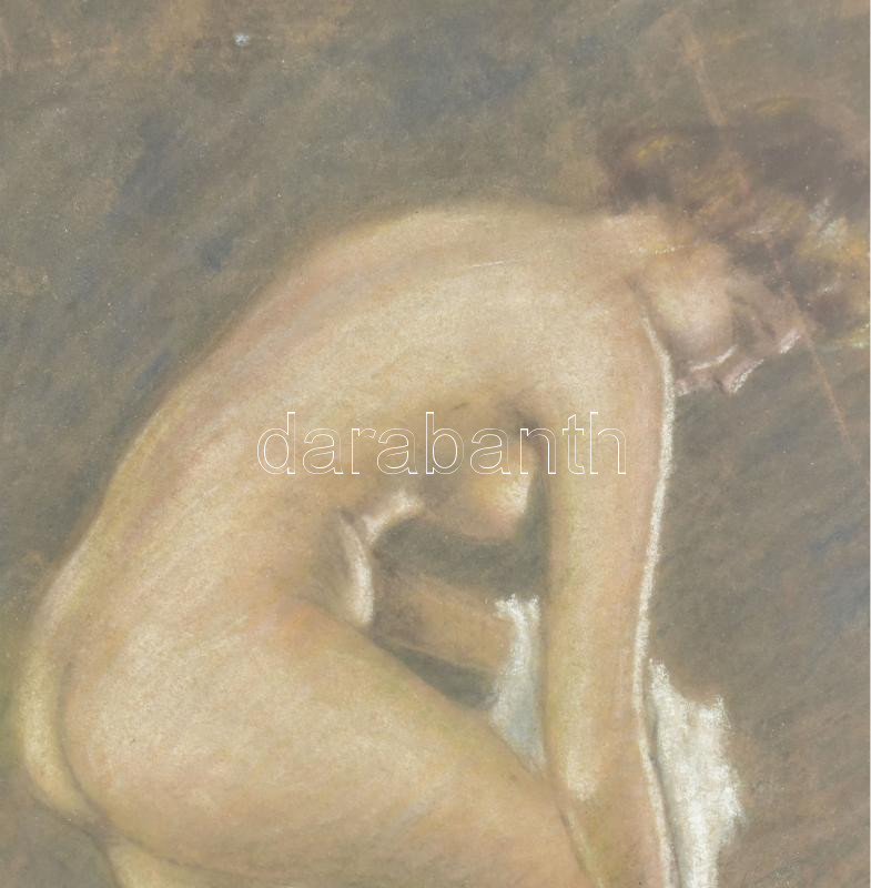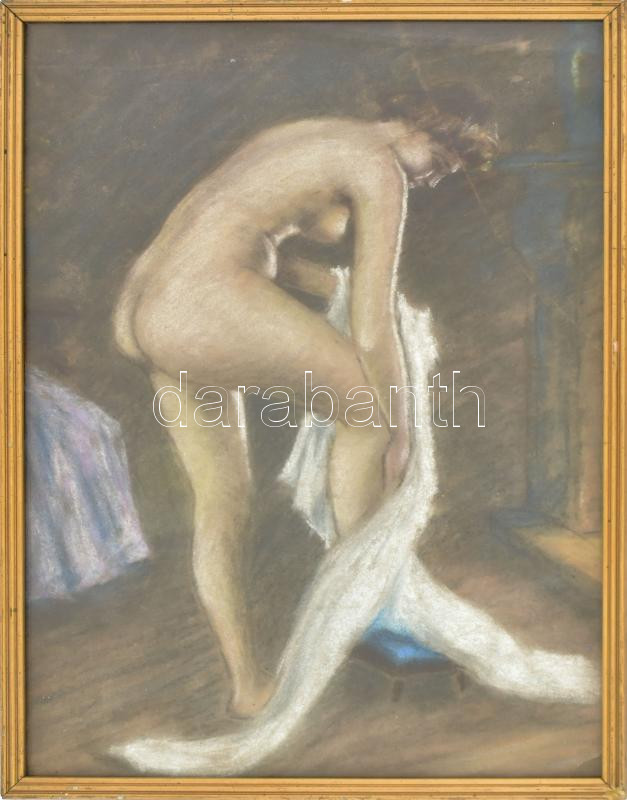 Jelzés nélkül, feltehetően 1920-40 körül: Fürdés után (női akt). Pasztell, papír, jobb alsó sarkában sérült. Üvegezett, kissé sérült fakeretben. 30x22 cm