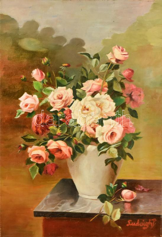 Ludvigh P jelzéssel, XX. sz elején működött magyar festő: Csendélet rózsákkal. Olaj, vászon, hátoldalán ajándékozási sorokkal 1914. évi datálással, 50×34,5 cm