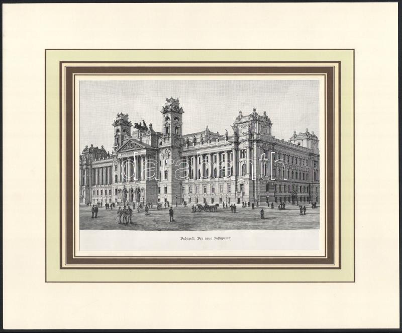 Az új igazságügyi palota épülete (Kúria, Budapest, Kossuth Lajos tér), rotációs fametszet, papír, jelzés nélkül, XIX. sz. vége, modern paszpartuban. 13x21 cm.