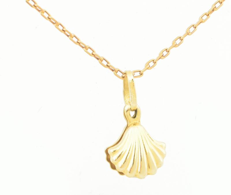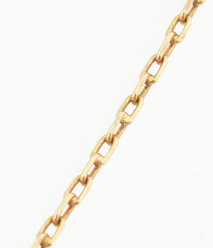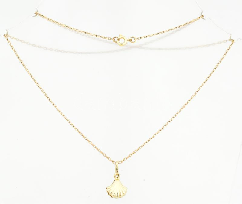 Beschreibung: Arany (Au) 14 K anker nyaklánc gyöngyös kagyló függővel, jelzett, h: 54 cm, 1,8×1,1 cm, bruttó: 4,4 g
