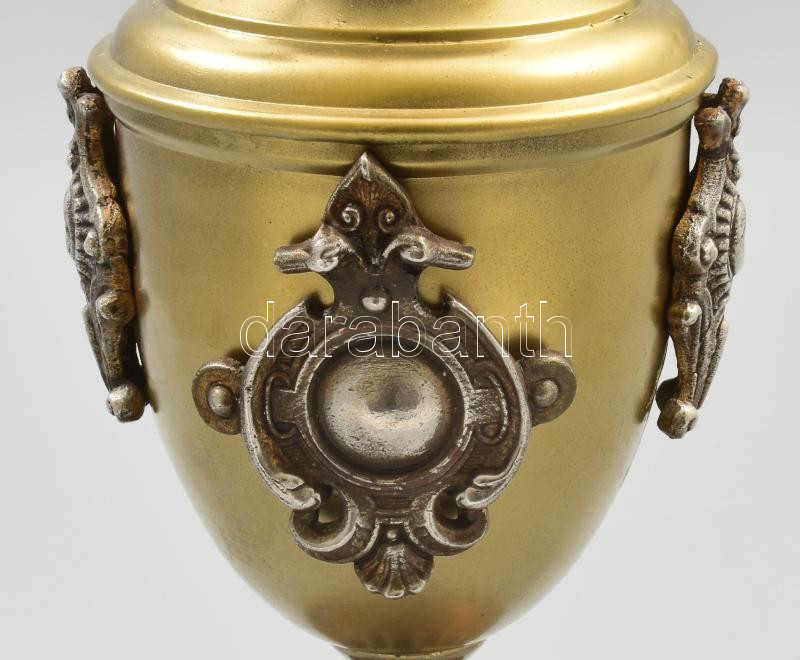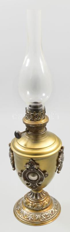 Beschreibung: Régi petróleumlámpa, fém testtel, díszes, vasutas jelzéssel, sérült, sérült üveggel, m: 57 cm