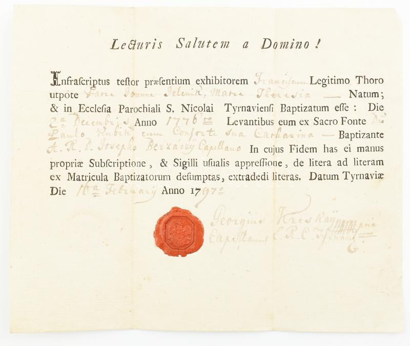 1797 Nagyszombat Kreskay György pecséttel és aláírással ellátott anyak... https://www.darabanth.com/de/442-Fernauktion/442.0/Kunst-Dokumente-andere-Sammelgebiete/Dokument~500021/1797-Nagyszombat-Kreskay-Gyorgy-pecsettel-es-alairassal-ellatott-anyakonyvi-kivonat~II2909986