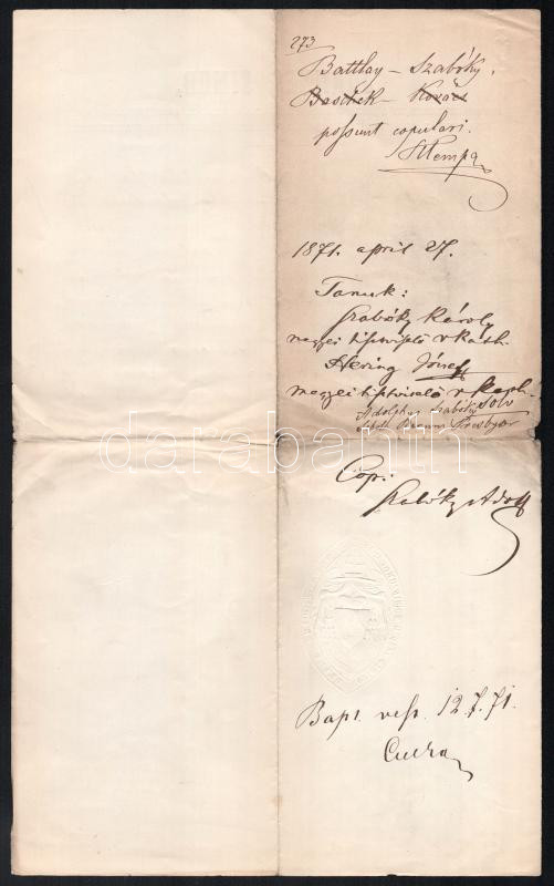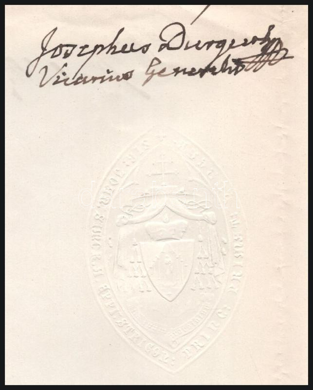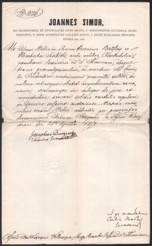 1871 Simor János esztergomi érsek latin nyelvű okmánya, Durguth József... https://www.darabanth.com/de/442-Fernauktion/442.0/Kunst-Dokumente-andere-Sammelgebiete/Dokument~500021/1871-Simor-Janos-esztergomi-ersek-latin-nyelvu-okmanya-Durguth-Jozsef-vikarius-alairasav~II2913120