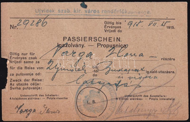 Beschreibung: 1915 Ujvidék, igazolvány (Passierschein) Újvidék és Bp. közötti utazásra, bal szélén kissé sérült