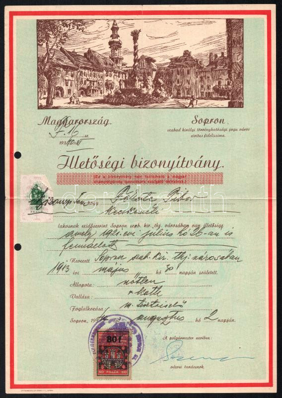 Beschreibung: 1940 Sopron, illetőségi bizonyítvány, fejléces illusztrált papíron, 1P és soproni városi illetékbélyeggel: 50f bélyeg 80f felülnyomással.